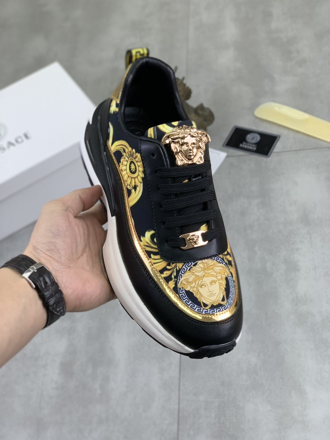 Este zapatos es de calidad AAAAA 1: 1 (excelente). Los materiales utilizados son idénticos a los originales. Las marcas registradas Versace son indistinguibles del auténtico. Las fotos toman por zapatos real, lo que usted recibe será 100% iguales con nuestras fotos.